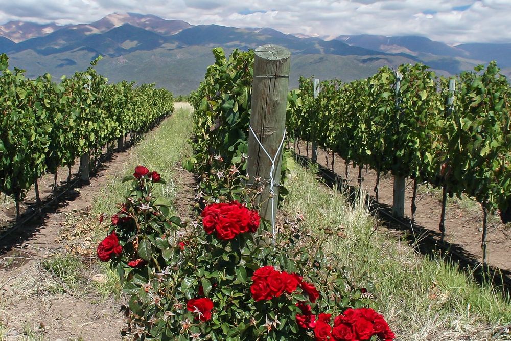 Red roses in a vineyard with the Andes mountain range in the background in the Uco Valley near Mendoza, Argentina.