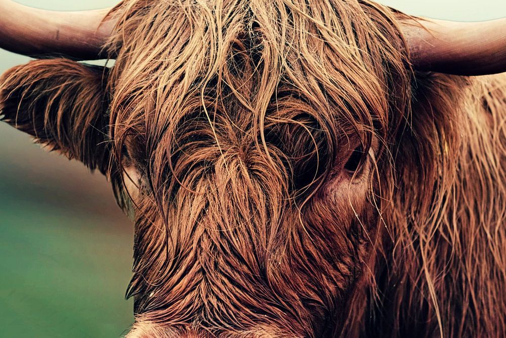 This beef is a Scottish Highlander. It has a long, shaggy reddish-brown coat that is ideal for cold climates. Its large, gracefully curved horns give it an imposing appearance. The fur covers much of the face, hiding part of the eyes, enhancing the natural look of this animal.