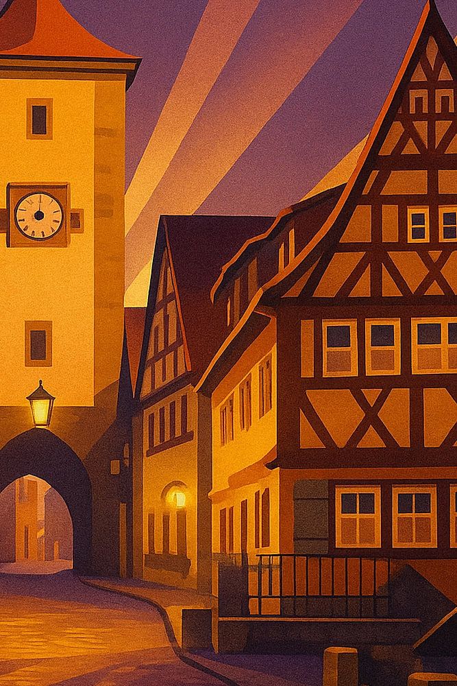 This Rothenburg ob der Tauber vintage travel poster evokes the enchanting atmosphere of Germany’s most romantic medieval town. The artwork depicts the iconic clock tower rising above cobbled streets, surrounded by half-timbered houses glowing under the soft purple and golden hues of sunset. Radiant beams of light emphasize the dreamy, fairytale quality of this Franconian gem. Styled in an Art Deco aesthetic, the poster combines clean lines, bold colors, and timeless elegance, making it a perfect decorative piece for lovers of historic towns and German heritage. Rothenburg is celebrated worldwide for its preserved medieval architecture and charming streets, which inspire travelers from around the globe. Ideal for adding warmth and character to your home, this poster makes a striking wall feature for living rooms, studies, or creative spaces. A must-have for those who appreciate vintage design, old-world beauty, and the romance of Rothenburg ob der Tauber.