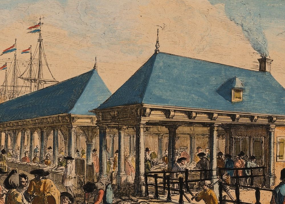 A print with a cityscape in color of important and then famous buildings in the port city of Rotterdam from the 17th, the Dutch Golden Age.