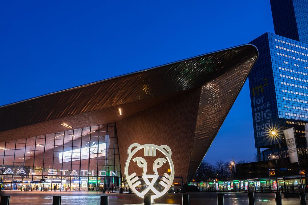 Rotterdam central station with IFFR sign (international film festival Rotterdam). New central station, nicknamed hairdressing salon.