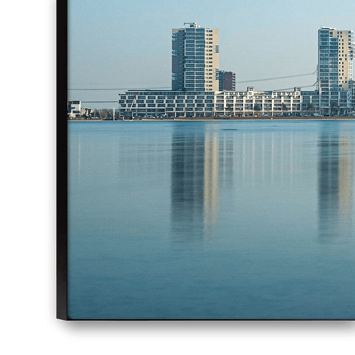 Here, I chose a minimalist rendering and reflection of three prominent eye-catching apartment buildings in the seven-home lake. The weather was very nice and clear, so the blue creates a fresh atmosphere. I used a grey filter and a slow shutter speed here, It would not look out of place in a sleekly decorated living room or waiting room in an office. A photo like this makes the busy rotterdam conurbation suddenly seem less crowded.