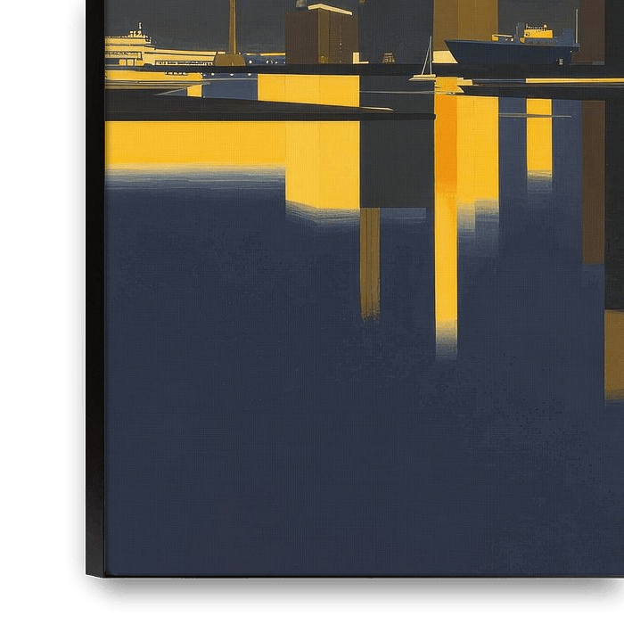 The port of Rotterdam in nocturnal blue with warm light accents reflecting in the water. The geometric shapes and the contrast between dark and light give the work a serene, modern look. A quiet moment in a dynamic city.