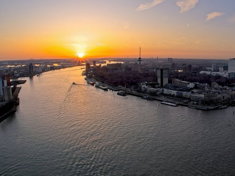 This photo was taken from a height of around 130 metres on top of an office building on the Kop van Zuid at the end of a warm afternoon. This is the time of day that photographers call the ‘Golden Hour’ because of the many warm tones.