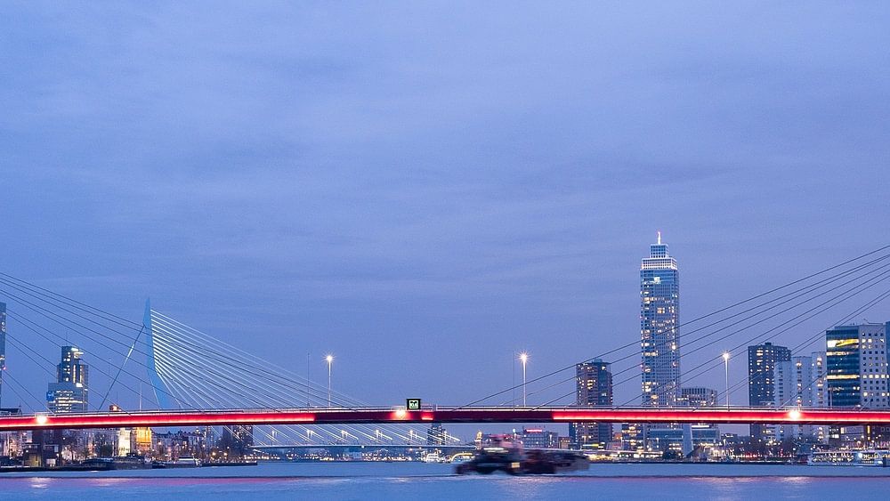 The photo shows the illuminated Willemsbrug in Rotterdam at night. The bridge has a vibrant red colour, contrasting with the blue tones of the water and sky. City buildings can be seen in the background, also illuminated. The water reflects the city lights, creating a shimmering effect. The overall atmosphere is serene and urban. The sky is overcast, indicating a cool evening.