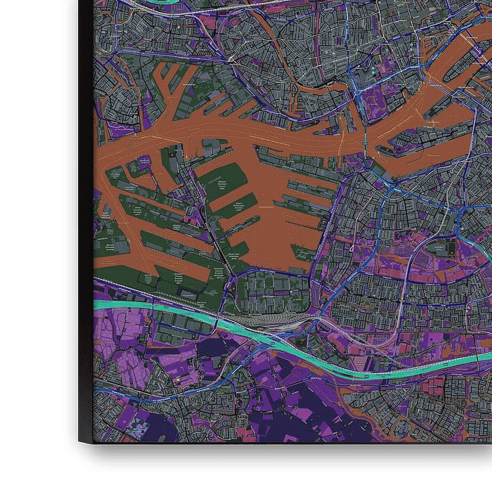 Detailed street map of Rotterdam in negative with all roads, parks, harbour and waters as the Nieuwe Maas in negative with orange, purple and blue