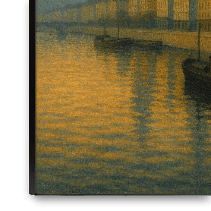 Rouen at Dusk drifts between mist and memory. The river glows in tones of amber and rose as the sun sinks behind the hills, and the cathedral’s silhouette rises faintly through the haze. The quiet water carries reflections of the city’s façades, their colors melting into the evening air.