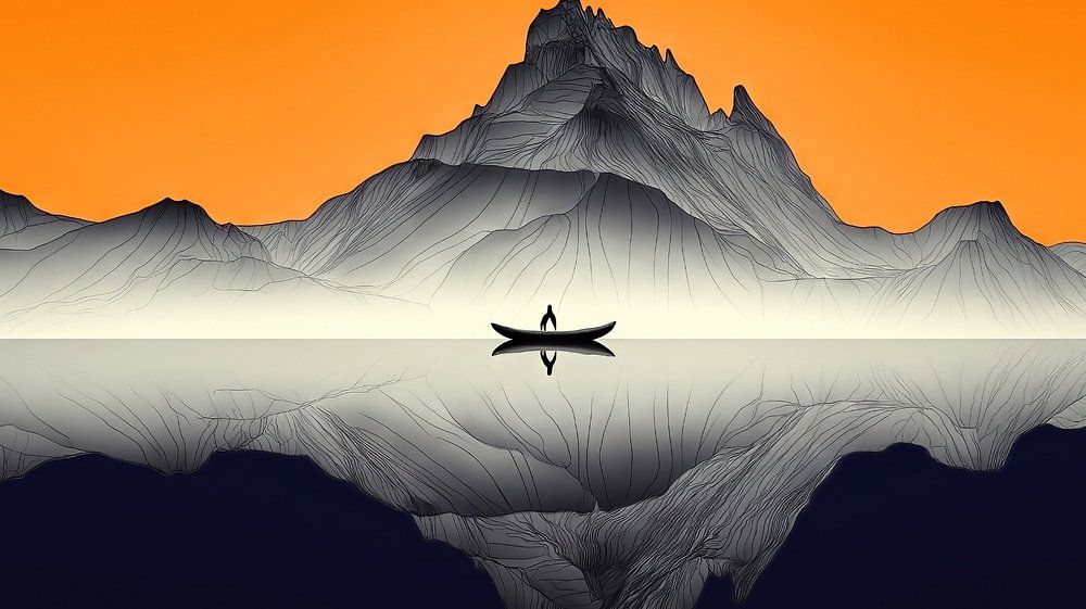 A lone man rows across the still waters of a lake, which captures the surrounding mountains and the bright orange sky in an almost mirror-like reflection. The scene exudes calm and serenity, while the vibrant colours of the sunset contrast beautifully with the clean lines of the mountain silhouettes and the calm water. This painterly depiction of a peaceful moment in nature conveys a sense of freedom and inner peace, perfect for lovers of landscape art.