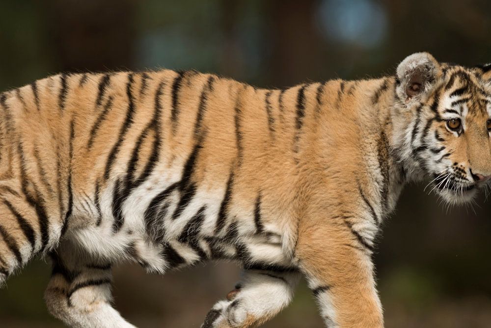 Royal Bengal Tiger ( Panthera tigris ), walking along the edge of a forest, full side view, young animal, soft light.