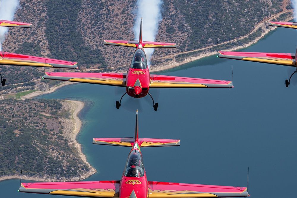 The team flies the demo's with four aircraft and has a fifth aircraft on standby at all times as a reserve. In 2018, the team commissioned the Extra 330LX as a replacement for the older Extra 300L aircraft. The team has been demo'ing at airshows in Europe, North America, Asia and North Africa over the years.