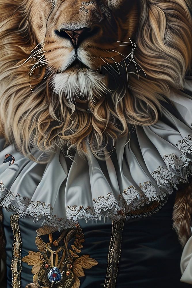 This extraordinary work of art shows a lion in splendid baroque clothing, crowned and posing majestically. The detailed depiction of the royal robe and the imposing presence of the lion convey a powerful elegance. A fascinating eye-catcher that combines traditional baroque splendour with the wild grace of the king of beasts. Perfect for collectors and art lovers looking for a unique and imposing piece for their gallery or office.