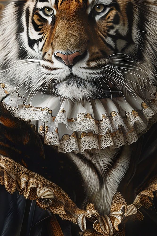 This impressive work of art captures the majestic presence of a royal tiger in all its splendour. With an elaborately decorated collar and a magnificent crown, the picture shows the tiger as a noble ruler. The detailed depiction and sophisticated colour scheme make this picture a perfect highlight for elegant living rooms or stylish offices. It lends any room a regal and luxurious atmosphere.