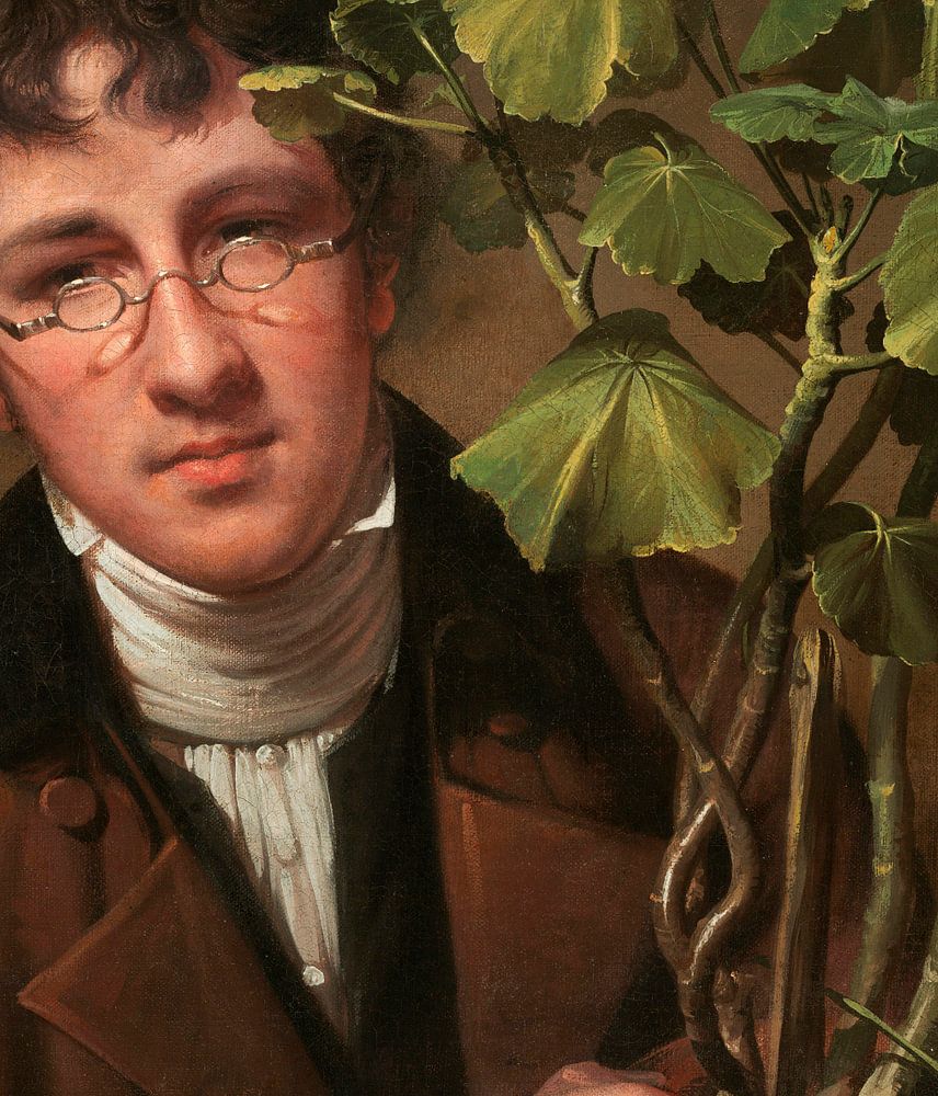 Painted in Philadelphia, the work could be described as a double portrait because the geranium, reputed to be the first specimen of this exotic plant ever grown in the New World, is as lovingly portrayed as the painter's brother is. The Peale family often collaborated in their endeavors, and here Rembrandt commemorated his brother's horticultural triumph. Rembrandt's own skill is evident in the clearly defined pools of light on Rubens' cheeks. In a phenomenon familiar to all, his glasses focus the beams passing through them, thereby forming the brighter disks of light under his eyes.