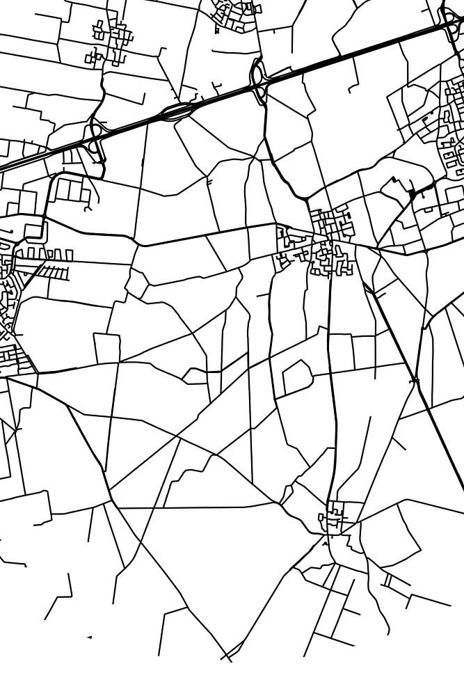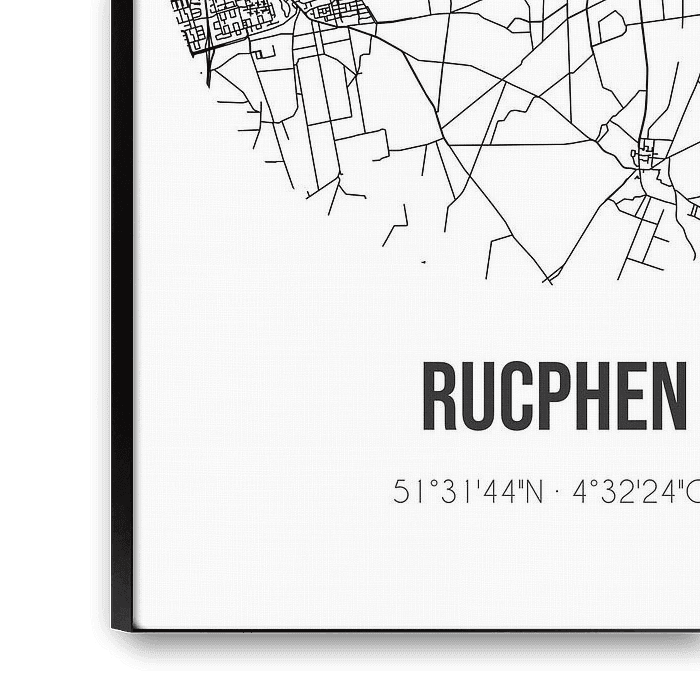 Black and white map, street map or street plan of Rucphen. Rucphen is located in the municipality of Rucphen, province of North Brabant. On the city map all public roads in Rucphen are included. Furthermore, the map features the coordinates of the center of Rucphen.