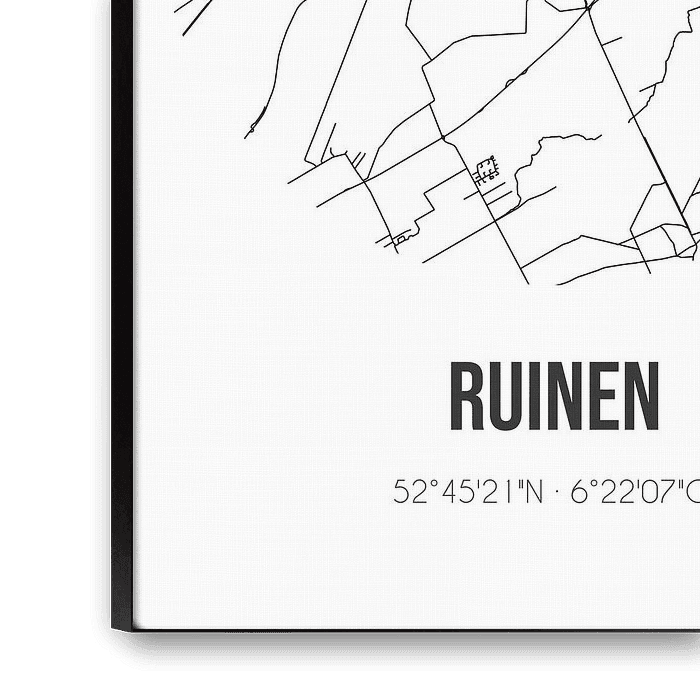 Black and white map, street map or street plan of Ruinen. Ruinen is located in the municipality of De Wolden, province of Drenthe. The city map includes all public roads in Ruinen. Furthermore, the map features the coordinates of the center of Ruinen.