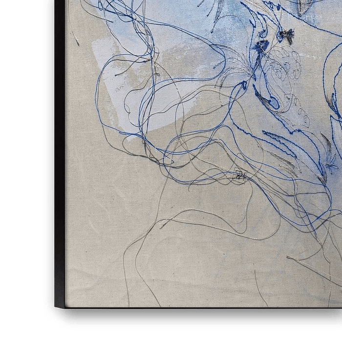The thread plays the main role in my works, inspired by the moments of life, I hope to give the viewer a moment or feeling of recognition, an inner experience, something that makes you wander in your own thoughts. The loose threads represent growth & change. In my originals, these move with warmth & wind & can be laid on the canvas according to your own feelings.