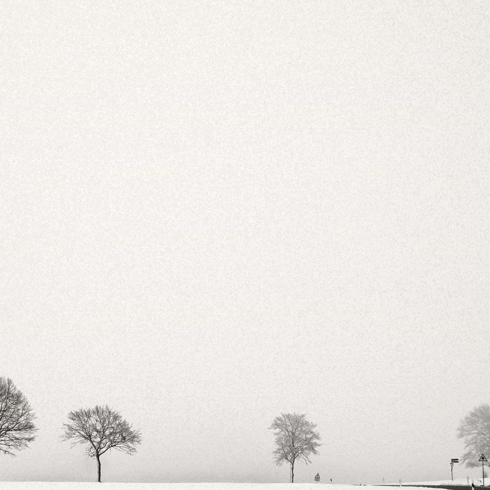 Photography of a winter landscape with a road and trees in a minimalist style in black and white. It's part of the Silence series.