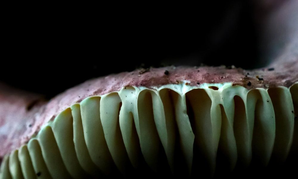 Against the black background, the hat of this russula becomes an almost abstract curve.