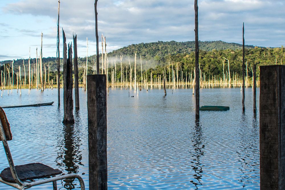 Een stoel op een aanlegsteiger, een prachtige plek om uit te kijken over het magische Brokopondostuwmeer met zijn honderdduizenden dode bomen die uit het water steken. Op de achtergrond met mistflarden omgeven Brownsberg natuurpark. Een stukje Amazone gebied in Suriname.