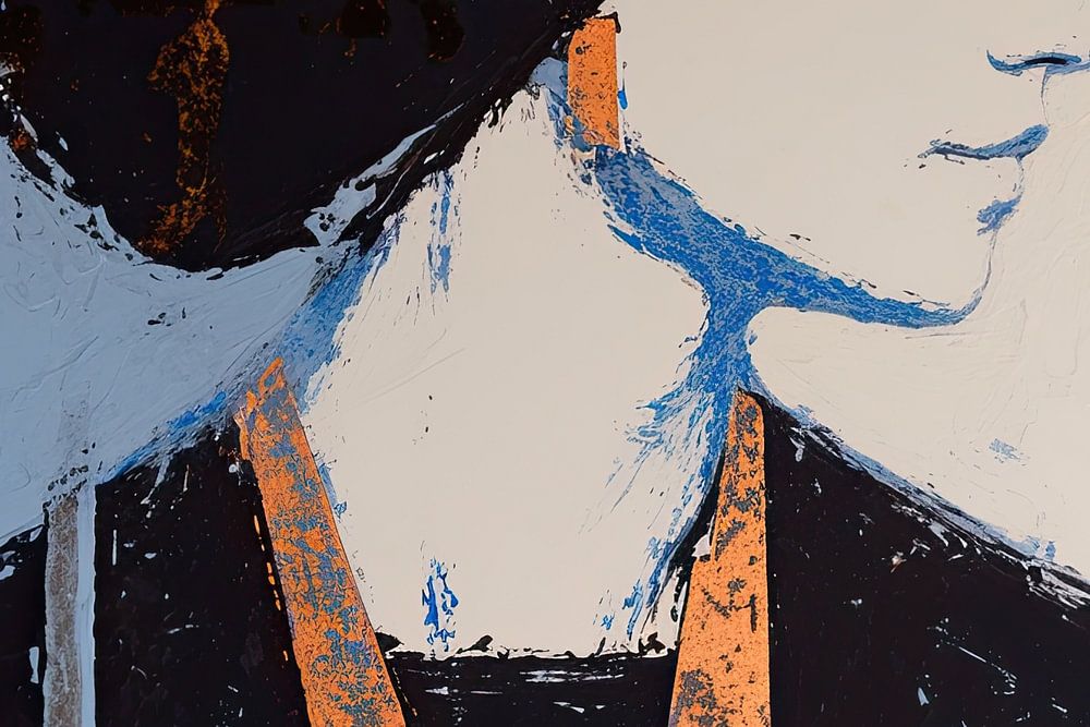 Details: woman, portrait, abstract, blue, rust brown, urban, industrial, texture, modern, art