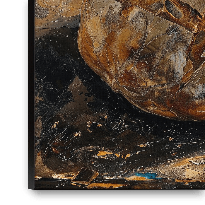 Rustic Bread - At the centre of this artwork is a lush, rustic bread. The painting style is expressive with visible brushstrokes, giving it a lively and dynamic feel. The warm, earth and gold tones create a homely and inviting feel, perfect for a kitchen or dining room that oozes cosiness.