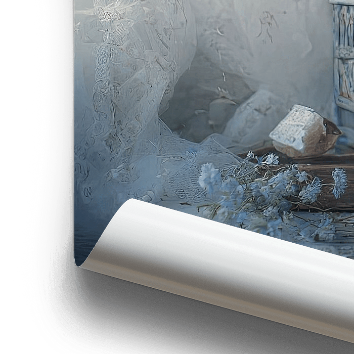 This romantic still life shows a rustic table scene with a jug, teapot, cup and lantern in blue and white patterns, surrounded by soft flowers. The warm tones and refined details bring a sense of nostalgia, homely charm and tranquillity to your interior. Perfect for a country kitchen, a vintage dining room or a cosy corner in the living room.