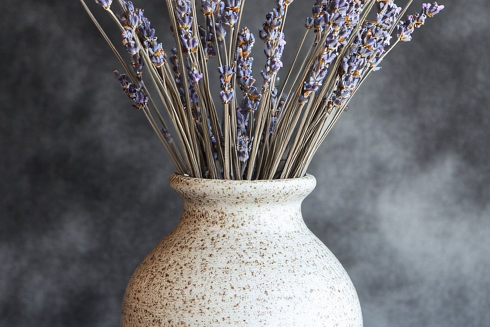 This beautiful picture shows a rustic, ceramic vase filled with dried lavender branches. The simple design of the vase and the soft tones of the lavender give it a minimalist and calm look. This stylish decor piece fits perfectly into a Japandi or minimalist décor and brings a touch of nature into the room. The dried lavender not only adds a sophisticated colour accent, but also creates a sense of calm and serenity. This design is ideal for living and dining rooms, where it contributes to a relaxing and atmospheric ambience. A perfect choice for those who love simple, natural beauty.