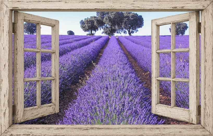A weathered wooden window opens onto neat rows of lavender that converge in the distance. The powerful interplay of lines creates a strong sense of depth, while the contrast between warm wood and cool purple tones evokes a serene atmosphere. Soft light falls on the window frames, emphasising the natural grain. In the background, a row…