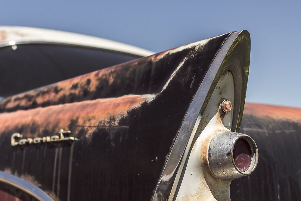 This picture shows a classic American car, an old DeSoto Coronet, whose weathered condition tells a story of days gone by. The bodywork is cloaked in rusty and peeling paint, giving it a nostalgic and weathered character. The iconic wings at the rear, typical of the 1950s, still show off proudly, though they are tarnished by the ravages of time.