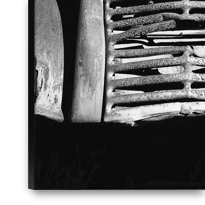 Radiator grill of a car wreck in the Arizona desert. Black and white.