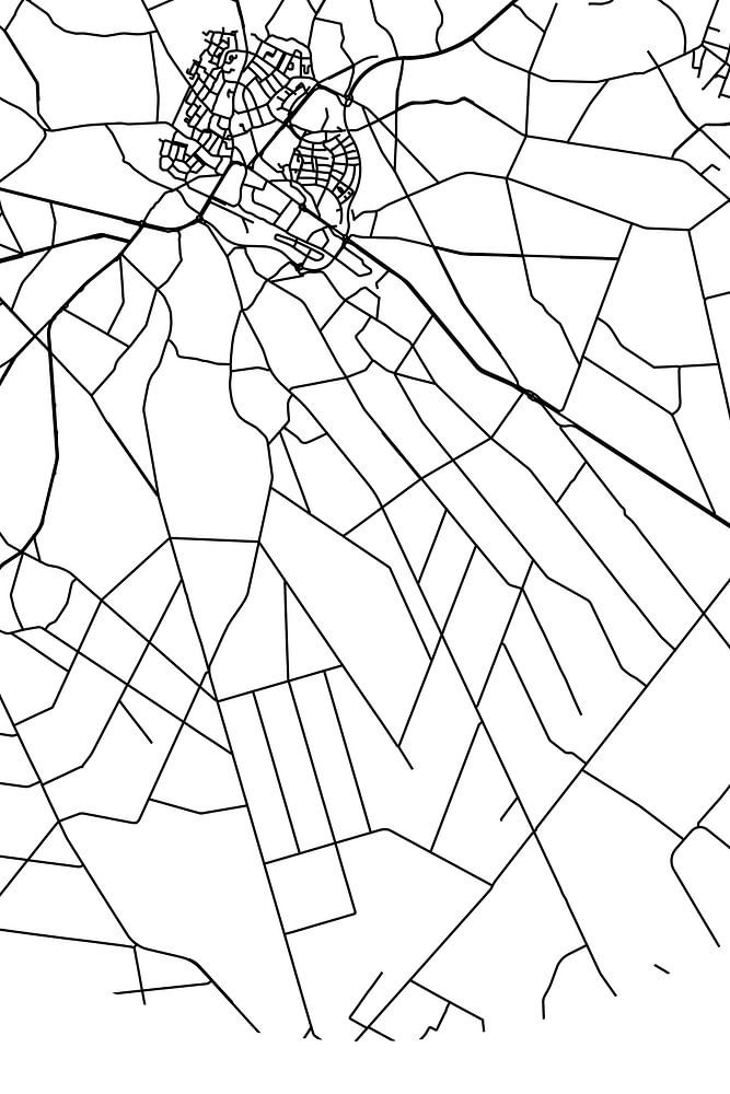 Black and white map, street map or street plan of Ruurlo. Ruurlo is located in the Achterhoek, in the municipality Berkelland, province Gelderland. On the city map all public roads in Ruurlo are included. Furthermore, the map is provided with the coordinates of the center of Ruurlo.