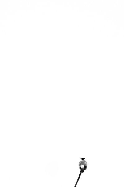 A solitary bird rests on a slender branch beneath an endless pale sky, surrounded by vast negative space.