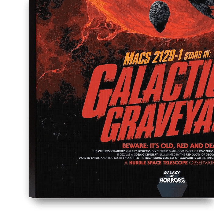 Galactic Graveyard Poster, MACS 2129-1. This chillingly haunted galaxy mysteriously stopped making stars only a few billion years after the Big Bang! It became a cosmic cemetery, illuminated by the red glow of decaying stars. Dare to enter, and you might encounter the frightening corpses of exoplanets or the final death throes of…