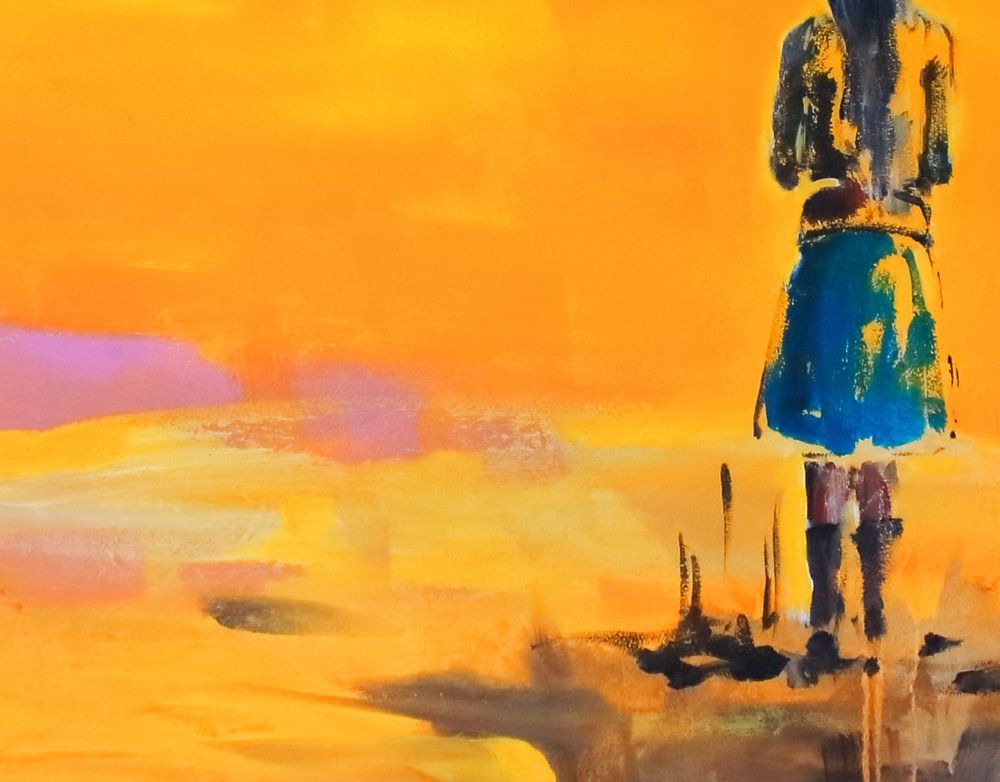 Semi-abstract portrait in bright colors. A girl stands with her back turned to us. Landscape in yellow, sunrise.