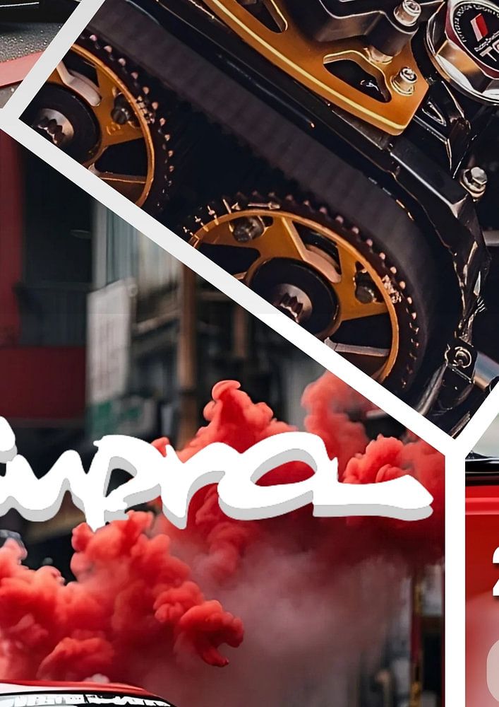 The image features a red Toyota Supra, a popular Japanese sports car, in a collage-style composition. The main image shows the car driving on a city street, leaving a trail of red smoke behind it. Other images showcase the car's front end, engine, and wheels. The car has a sleek, aerodynamic design with a low-slung profile and large wheels.