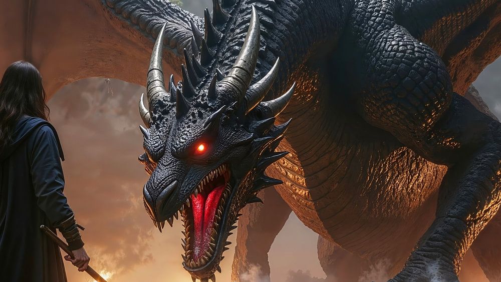 In the blazing firelight, a woman rises with a sword in hand, surrounded by smoke and water, as the black dragon towers before her. Its eyes burn with crimson fury, its wings fill the cave with shadow, and its roar splits the air like thunder.