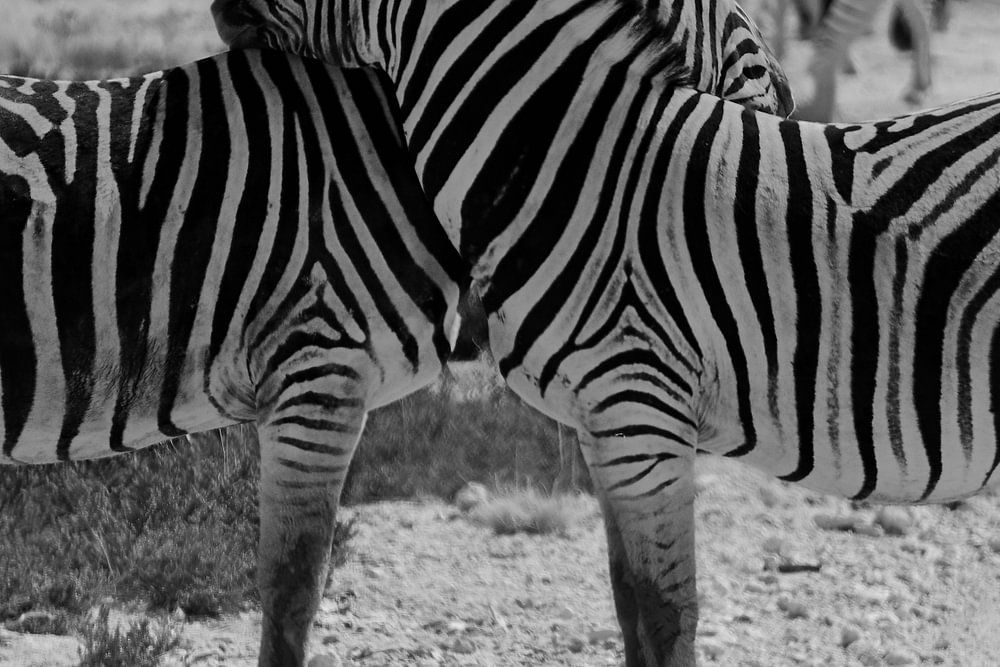 Two cuddling plains zebras in Etosha National Park, Namibia, Africa.