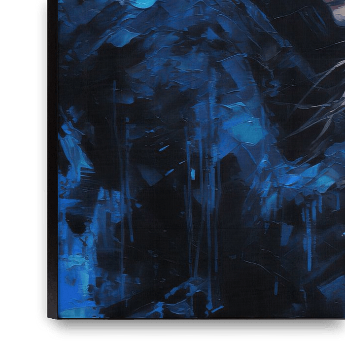 This abstract painting with expressive brushstrokes depicts an intimate embrace between a handsome man and woman. The different shades of blue flow together, creating a sense of passion and tenderness.