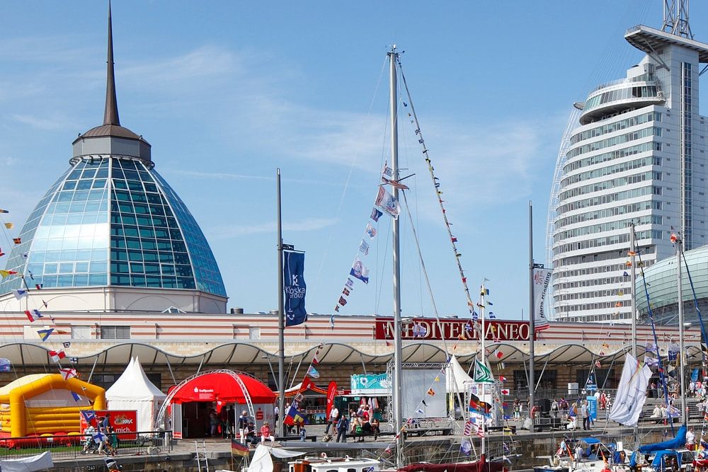Mediterraneo shopping centre, Klimahaus, sailboats and Atlantic Sail City Hotel at Sail 2015, Bremerhaven, Bremen, Germany