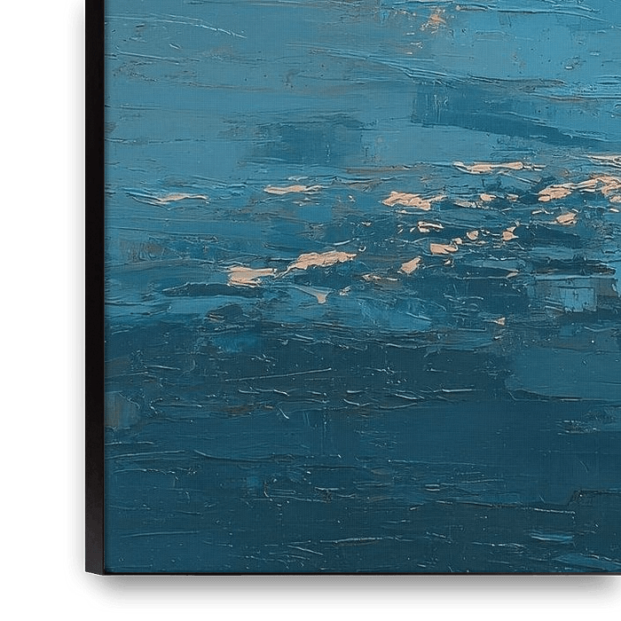 A minimalist oil painting shows a sailing boat on the ocean at sunset, seen from a low perspective. The sky glows in soft shades of blue and pink, which are clearly reflected in the water. Muted colours and precise brushstrokes emphasise the calm, elegant mood of the scene. The harmonious composition and fine details lend the work depth…