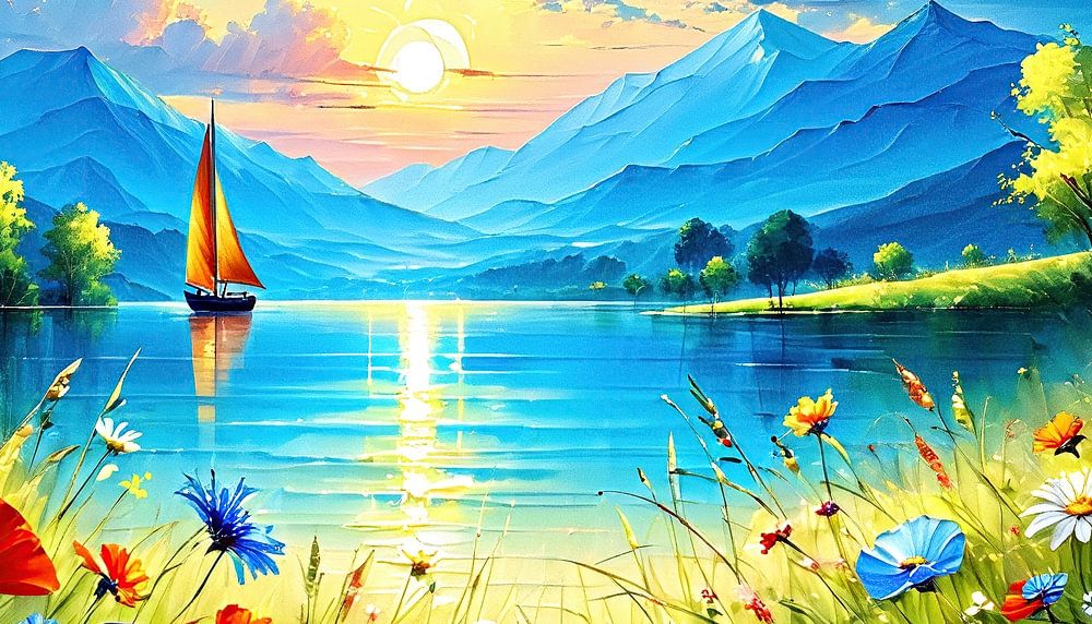 The viewer's gaze glides gently over the glowing sea of flowers towards the calm mountain lake in the centre of the picture. A single sailing boat silently makes its way across the glistening water - a floating symbol of freedom, tranquillity and longing.