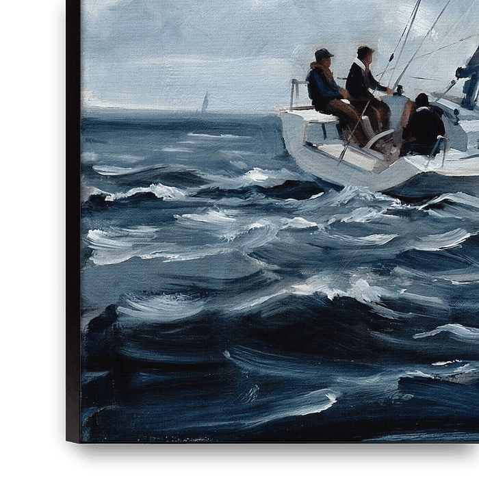 Immerse yourself in the dynamic world of competitive sailing with this impressionistic masterpiece. This oil painting captures the thrilling energy of a regatta, featuring two sailboats racing across a choppy, dark blue sea under a dramatic, overcast sky. The left sailboat, adorned with a vibrant red and white spinnaker, leans into the…