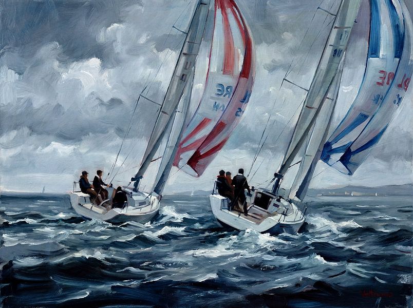 Buy this painting Sailboats Racing on Choppy Sea Painting by Jan Keteleer as a reproduction on canvas, ArtFrame, poster and wallpaper, printed on demand in high quality.