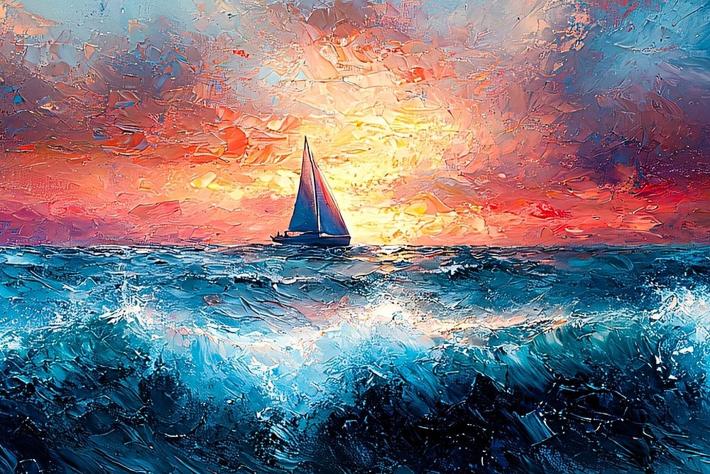 This beautiful painting captures the essence of a lone sailboat on a rolling sea under a dramatic sky. The sunset colours of orange and red contrast perfectly with the deep blue tones of the water, evoking a sense of movement and emotion. The painting exudes dynamism and brings a touch of adventure and calm to any room at the same time. Ideal for lovers of maritime themes and abstract art. This piece is a perfect choice for a living room or dining room where it can serve as an eye-catcher.