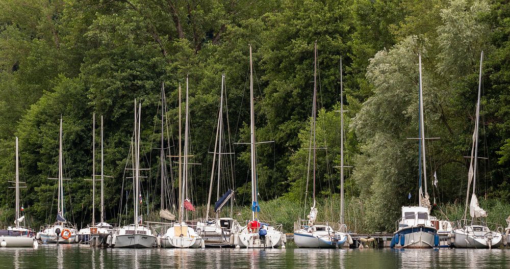 Lago di Caldonazzo. A beautiful lake in the Dolomites in Italy. A beautiful green environment and nature. There are few or no motorized boats on the lake, and that is actually quite peaceful. These sailboats are waiting, until they may go sailing again. A calming picture, which I like to watch. Can also be ordered in another cutout, with more green.