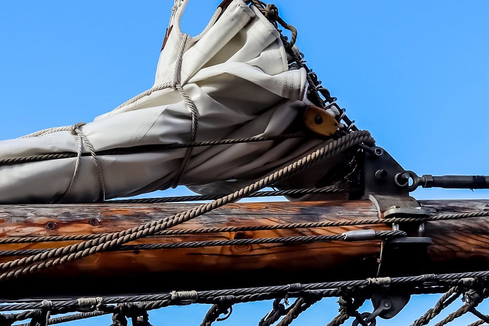 Buy the photo Sailing mast with many ropes in front of a blue sky by MPfoto71 on canvas, ArtFrame, poster and wallpaper, printed on demand in high quality.