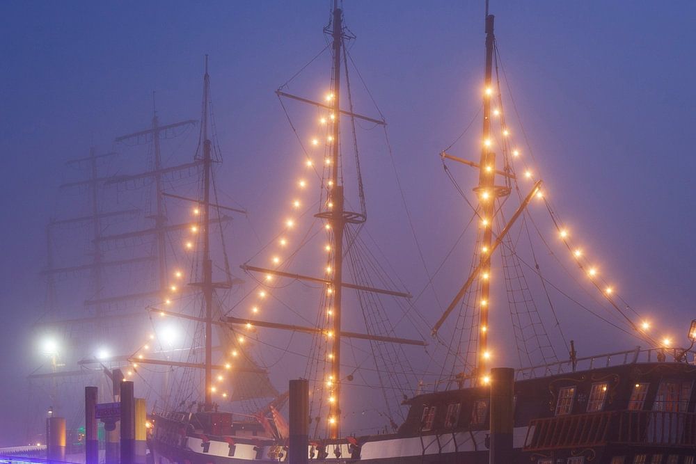 Sailing ship at the Schlachte in the fog at dusk, Bremen, Germany, Europe