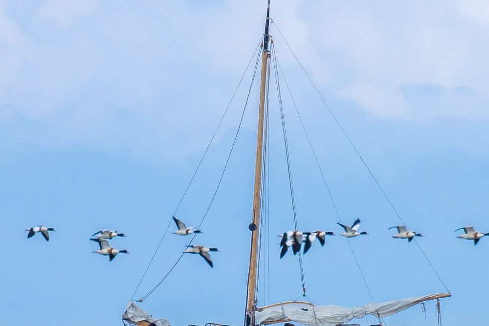 The photo shows a beautiful sailing ship The ship is sailing on the Wadden Sea near Koehool. Just as the picture is being taken, a flock of geese flies by.