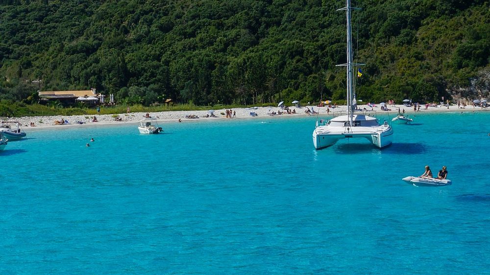 Sailing ships on paradise like turquoise water of greek island corfu bay in summer by adventure-photos