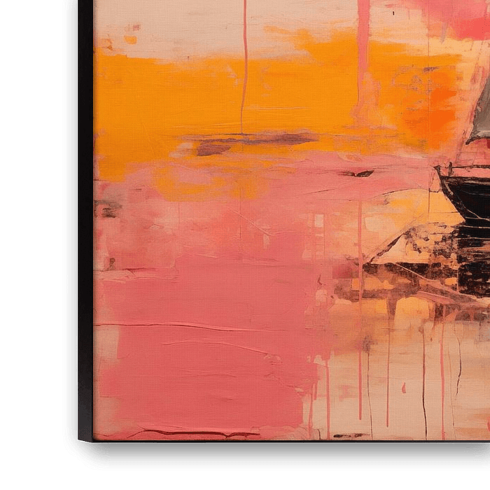 This work captures the romantic moment of a sailboat sailing under an enchanting pink sunset. The reflection of the warm light on the water enhances the serene atmosphere. The abstract brushstrokes and bright colours depict the peaceful union between sky and sea.